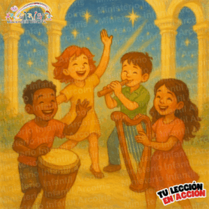 - El maestro los dirigirá para que toquen una canción simple de alabanza, primero todos juntos, luego por grupos de instrumentos. Se hablará sobre cómo cada instrumento tiene un sonido único, y juntos crean una hermosa música para Dios.