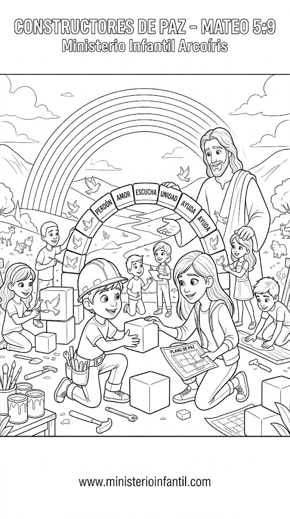 Narración: Imaginen a una gran multitud sentada en una colina. Jesús sube y empieza a hablar, pero no de reglas aburridas, sino de “Felicidad”. Mientras te pones el casco, explica que Jesús está dando los “planos” para una vida bendecida. Muestra la piedra y explica que el mundo a veces es duro y genera chispas de pelea. Pero luego, muestra el “cemento” (la arena) y explica que los constructores de paz son el pegamento que une lo que está roto. Jesús no dijo “benditos los que aman la paz” (que solo se quedan sentados deseándola), sino “benditos los que TRABAJAN por ella”. Ser constructor de paz significa intervenir, pedir perdón primero y calmar las tormentas.