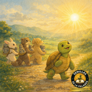 Este es Ramón, una tortuga muy sabia que siempre lleva su casa a cuestas. Un día, unos amigos le ofrecieron una estatua de piedra muy adornada. Le dijeron que esa imagen le traería protección, salud y mucha prosperidad. Le dijeron que no tenía nada de malo, que era solo una “tradición” y que tener una estatua lo ayudaría a sentirse más seguro.