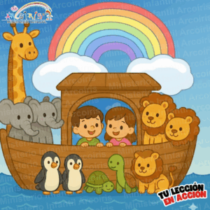 (Maestro, con voz de esperanza): “Después de muchos días y noches, la lluvia cesó. El agua comenzó a bajar, y finalmente, el arca se posó en una montaña. Y saben qué… ¡Dios puso un arcoíris en el cielo como una señal de su promesa de que nunca más destruiría la Tierra con un diluvio! ¡Noé y su familia salieron del arca, agradecidos y salvos, porque obedecieron a Dios!” La