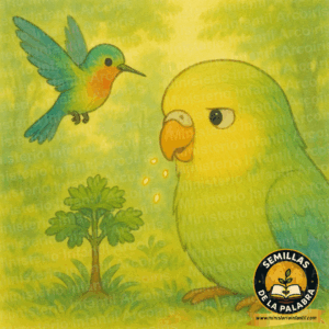 En el bosque vivía un lorito, Lino, que amaba hablar. Pero a veces, sus palabras eran como espinas, cortantes y rápidas, que herían a sus amigos. En cambio, había un colibrí llamado Paz, cuyas palabras eran como néctar dulce y suave. Un día, Lino le preguntó a Paz cómo hacía para que todos lo quisieran escuchar. Paz le dijo: “Lino, mis palabras son semillas. Si digo cosas amables, crecen árboles de vida, llenos de sombra y frutos. Si hablas con palabras apacibles, ellas van a producir un efecto muy grande y bonito en las personas que te escuchan, asemejado a un hermoso árbol frondoso con buenos frutos”. Lino decidió cambiar sus espinas por semillas de paz, y pronto, donde antes había enfado, ahora crecía un hermoso jardín de amistad.