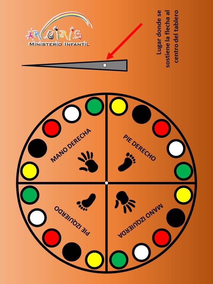 Primero deben explicar lo que significa cada color y luego jugar, girando la flecha para que los nios, por turno, coloquen sus manos o sus pies segn lo que indique la flecha: